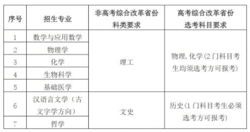 为突出基础学科在国家关键领域的支撑引领作用,同时聚焦国家人才紧缺的人文社会科学领域,我校强基计划招生专业设置如下:数学与应用数学、物理学、化学、生物科学、基础医学﹑汉语言文学(古文字学方向)﹑哲学。