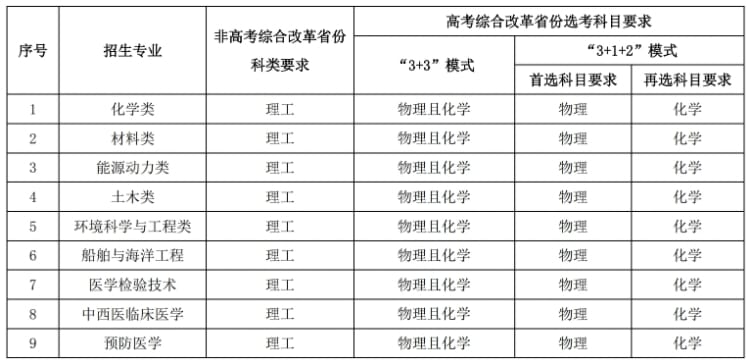 高校专项计划招生160人,招生专业为化学类、材料类、能源动力类、土木类、环境科学与工程类、船舶与海洋工程、医学检验技术、中西医临床医学、预防医学。我校将根据各省份入围资格学生人数,确定具体的分省分专业招生来源计划,并通过学校本科招生信息网公布。